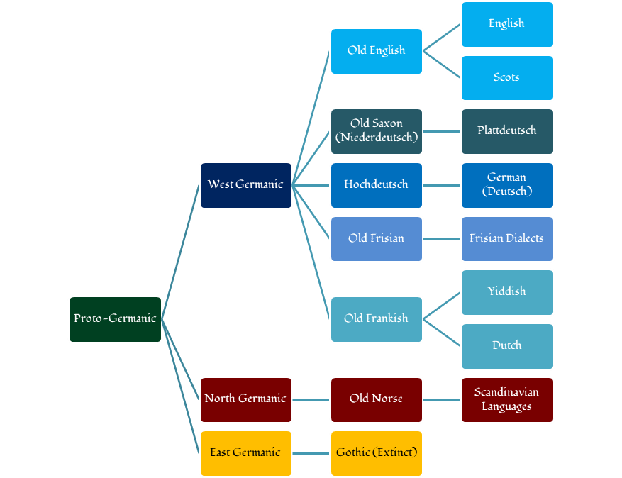 Below you will find an abbreviated language tree for Germanic languages, this will give you an idea of the relationship between the language families as English and Scots are more related to each other than English is to Dutch, but English and Dutch are more related than English is to Icelandic (which would fall under the Scandinavian languages category that was left as one block to keep the graphic smaller).